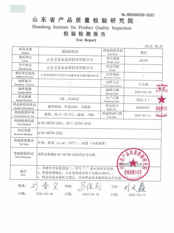 缓蚀阻垢剂检验检测报告